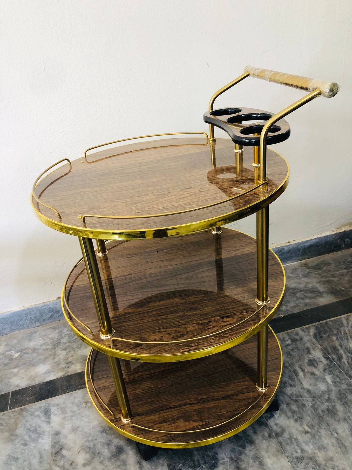 Tea Trolley circular model Three Shelf Wooden Top with Stainless Steel Rod Installed Size: 24 inch Width, 24 inch length, 32 inch height Water proof UV Lasani sheet scratch-less shining Imported Wheel